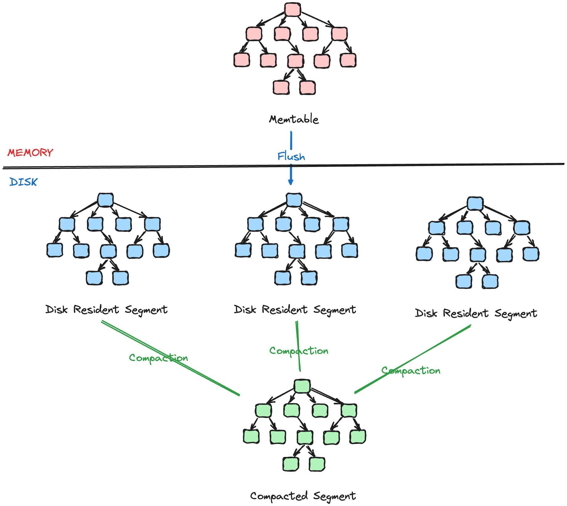 Multi-component LSM Tree: Multiple Disk components, Memtables flushed on exceeding threshold. Requires periodic merge process called Compaction.