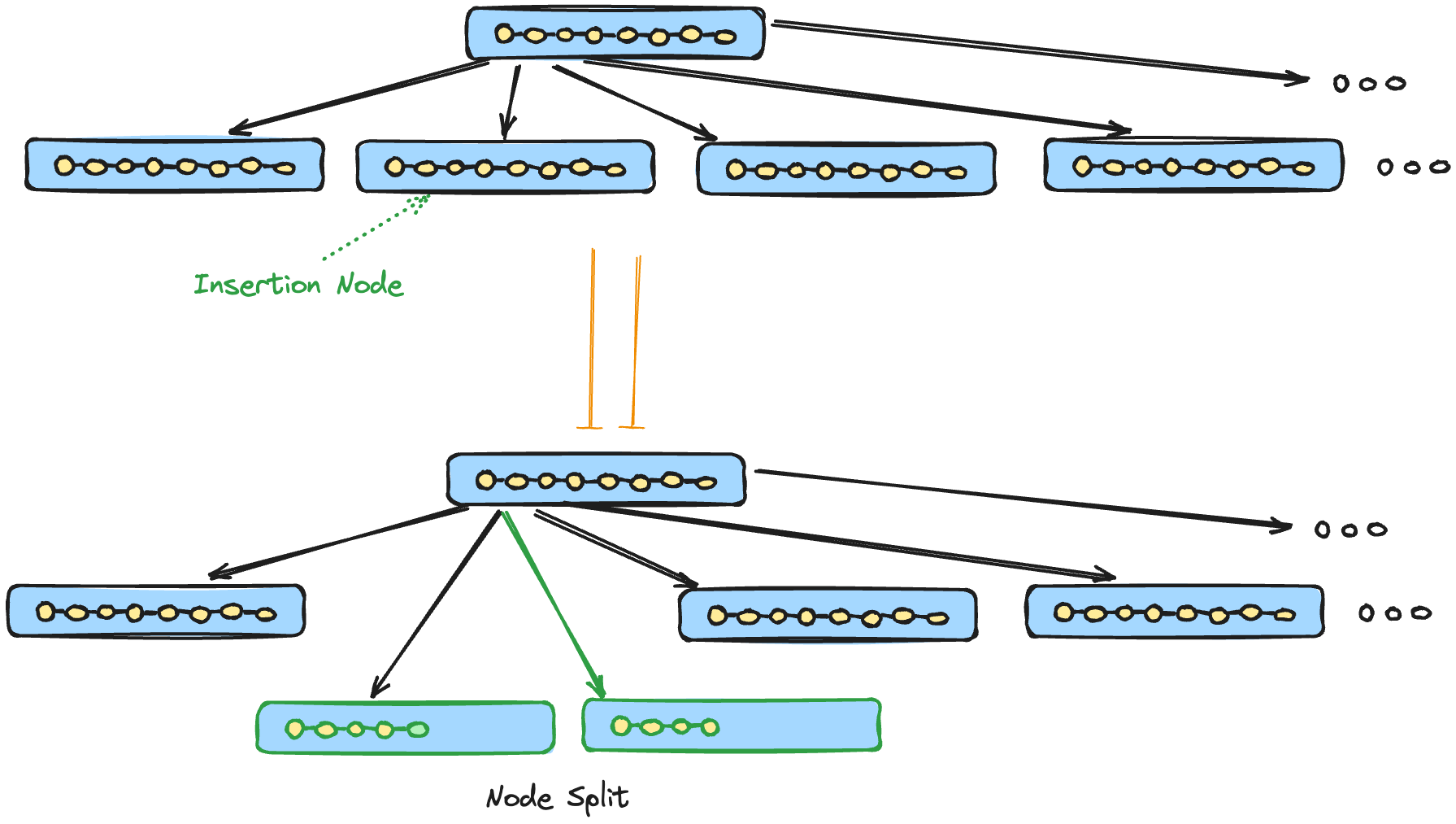 Since B Tree nodes have a defined capacity, insertions and deletions may cause two scenarios: