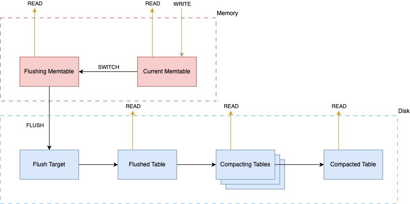 The following figure reproduced from the one in “Database Internal by Alex Petrov“ (Chapter 7) denotes the Read and Write Paths against the components of an LSM storage engine: