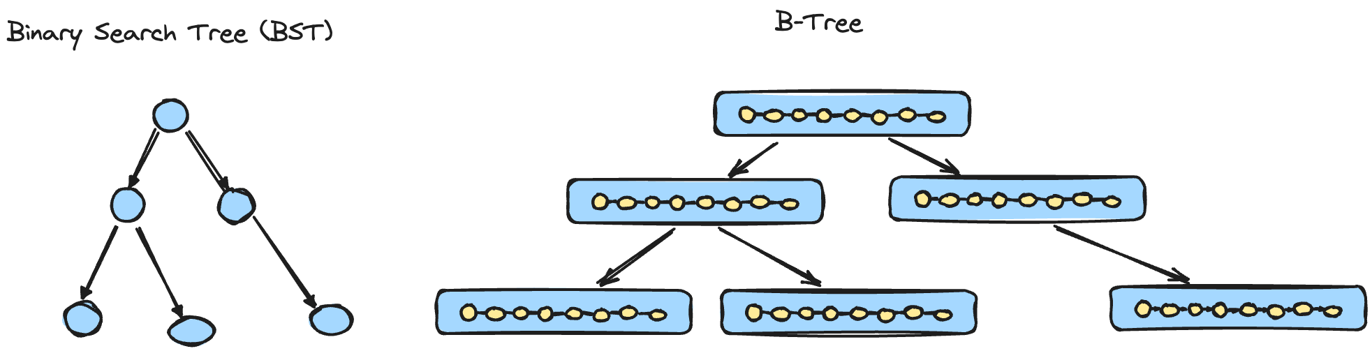 “B-Trees build upon the foundation of Balanced BSTs and are different in that they have higher fanout (have more child nodes) and smaller height.” - Database Internals by Alex Petrov