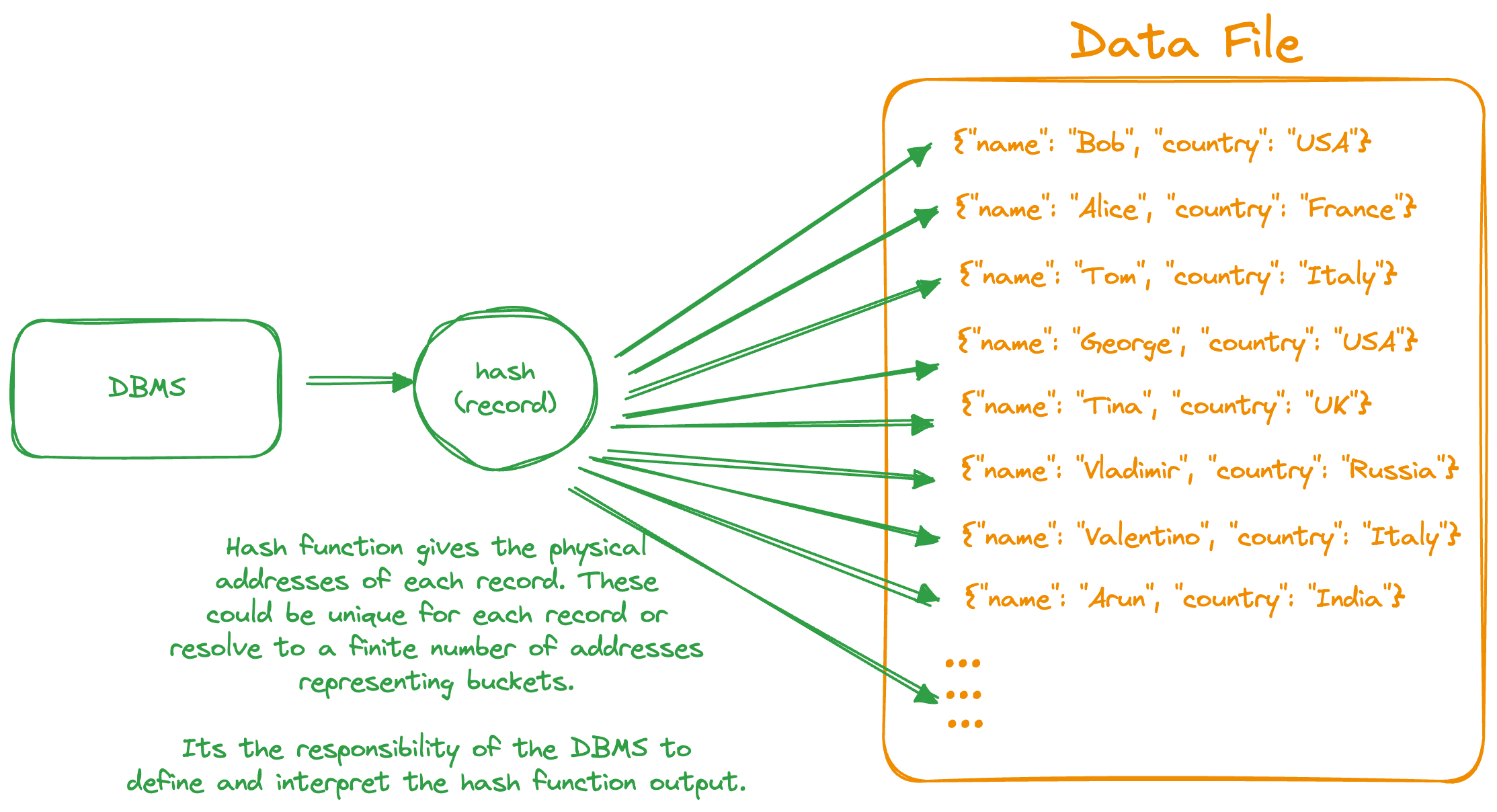 Above is a simple representation of how the data is logically stored under the Hash-Organized scheme. This scheme is efficient for exact-match search type queries.