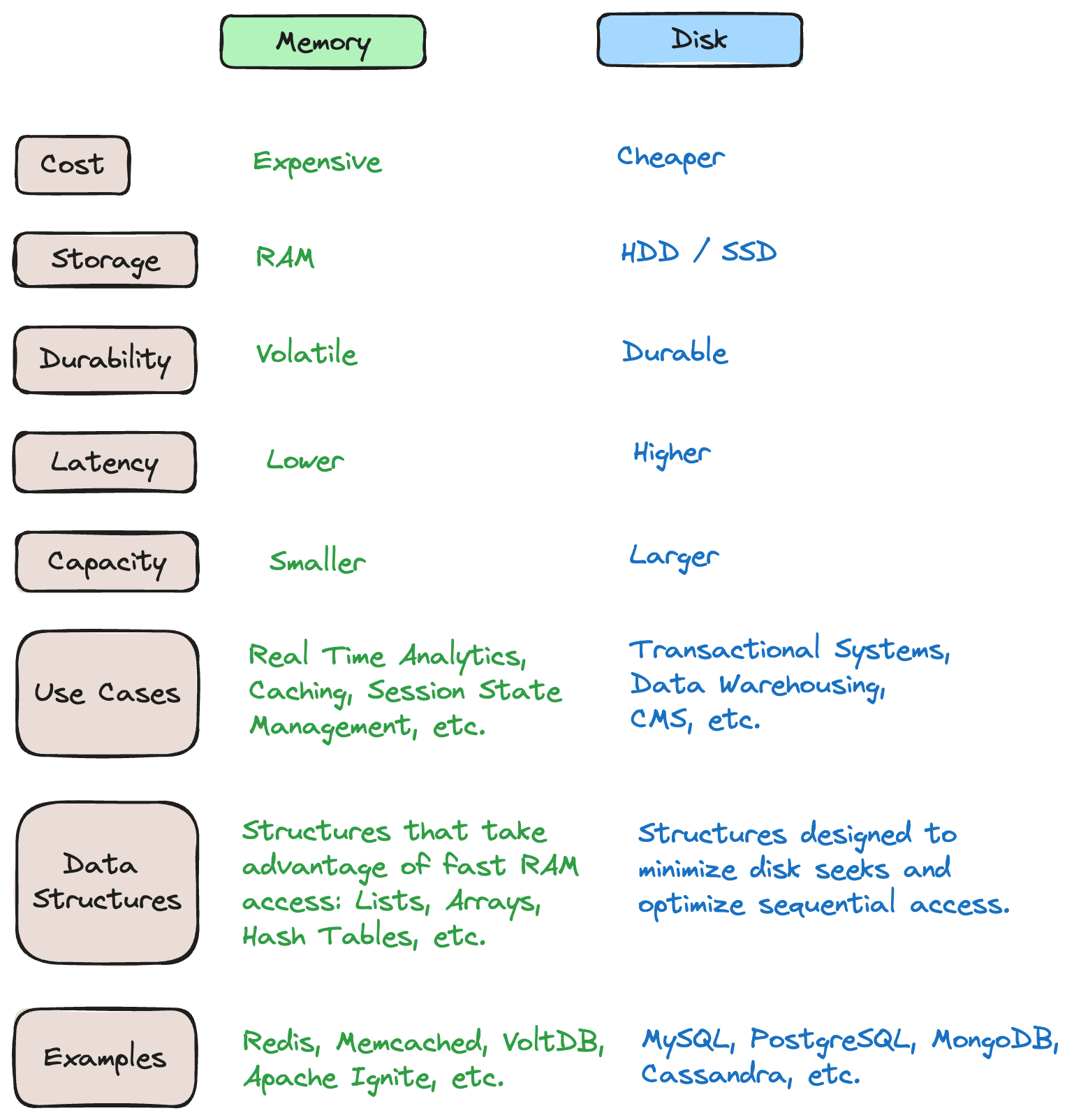However, the distinction of databases according to storage medium (In-Memory vs Disk) remains the focal criteria for evaluating DBMS solutions. The following chart depicts the primary differences between In-Memory and Disk-Based DBMS.